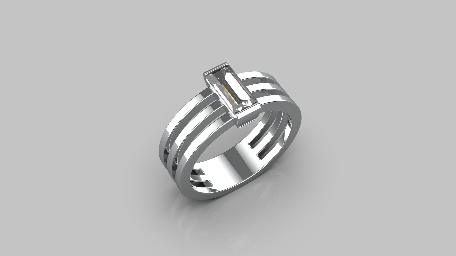This triple-band silver ring features a sleek baguette-cut stone at its center — sharp, clear, and perfectly balanced. A statement of structure and simplicity, crafted for those who love clean lines and quiet strength.