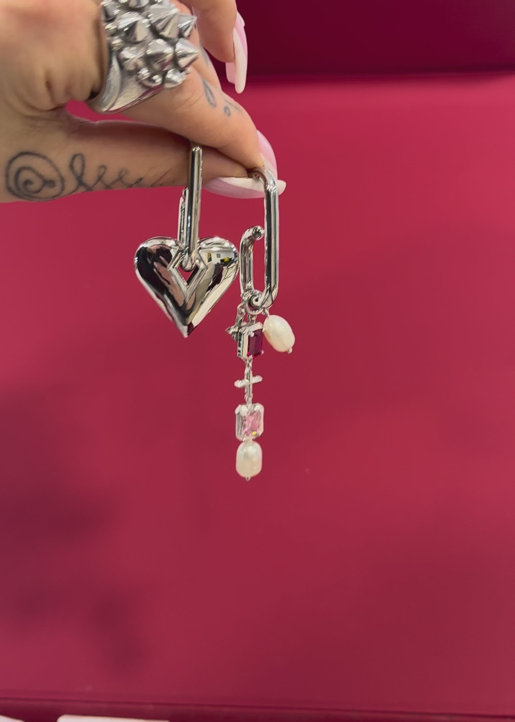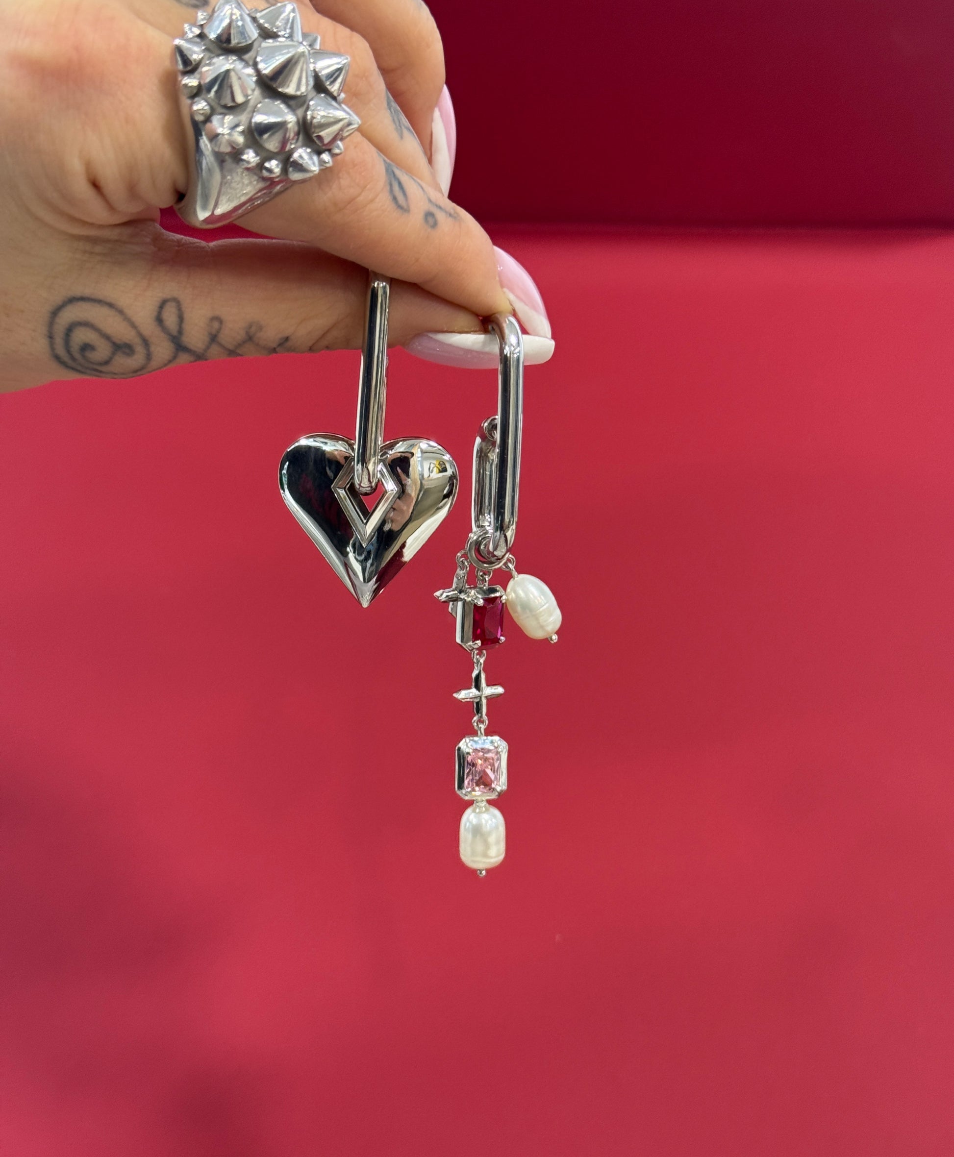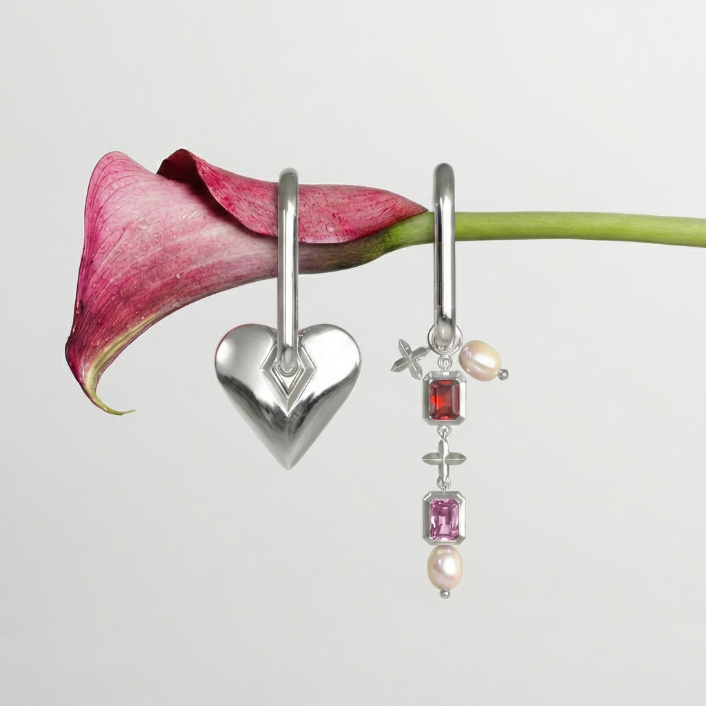 The other earring is softer and more romantic, featuring pink and red gemstones combined with delicate pearls, symbolizing tenderness, warmth, and femininity.
