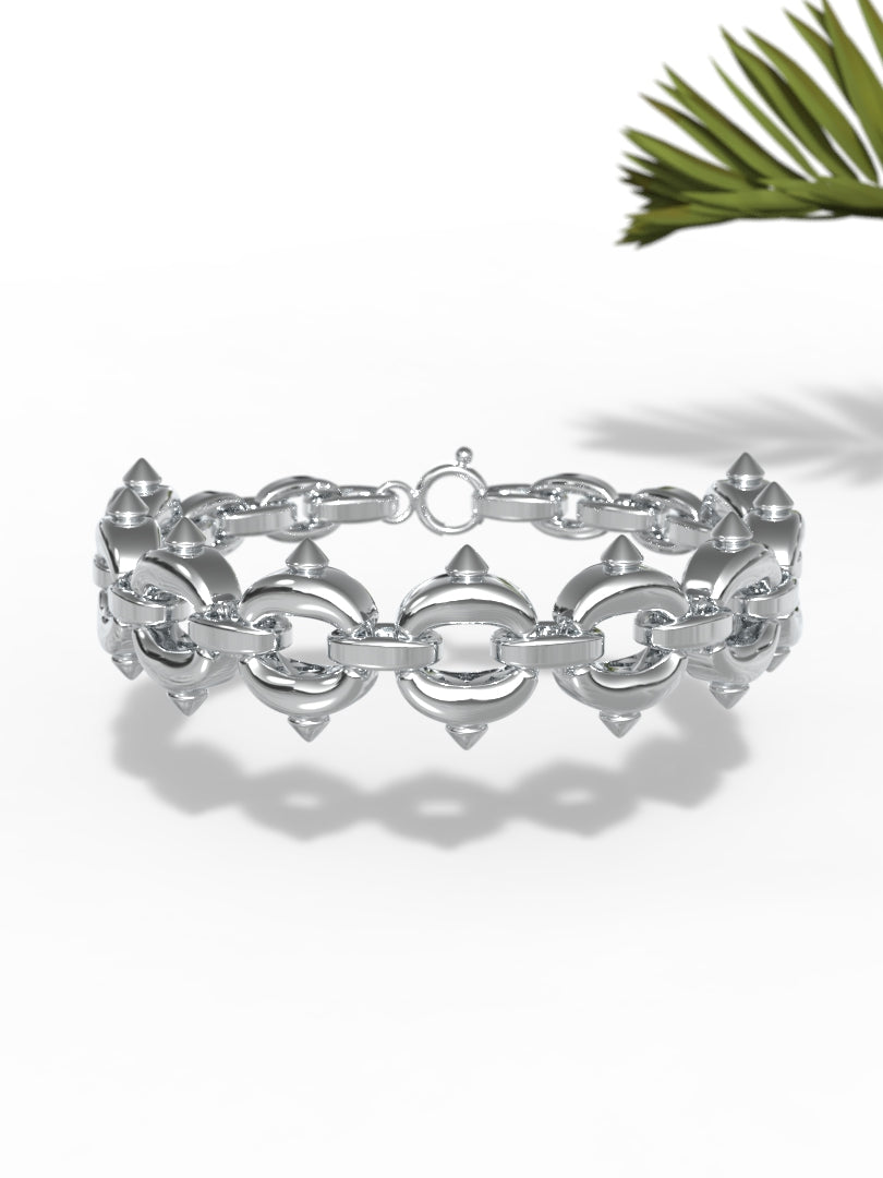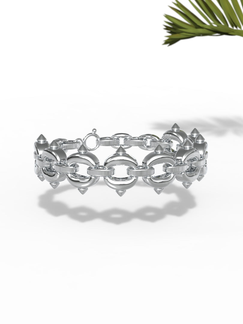 The chunky silver chain is covered in sculpted spikes, creating a powerful balance between beauty and edge.